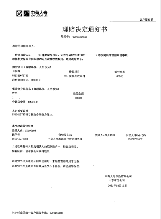 客戶去世時正是2021年年三十凌晨,家人悲痛之余處理了后事。泰安分公司侯燕紅經(jīng)理協(xié)助客戶理賠資料整理后遞交,中荷人壽在3月17日收到理賠資料后于下午2:10錄入初審系統(tǒng),快速開展理賠程序,當天晚上7:20系統(tǒng)結(jié)案處理完畢,按合同約定賠付其家人60000元。