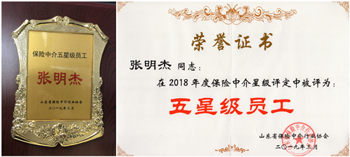 在對2018年度的表彰中,山東四方華邦保險代理有限公司被評為“保險中介五星級機構”,濰坊分公司張明杰經理被省行業(yè)協會評為“五星級員工”,泰安分公司侯玉濤經理被省行業(yè)協會評為“星級員工”。