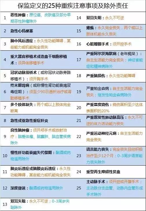 以下是,25種重疾注意事項(xiàng)及除外責(zé)任:
