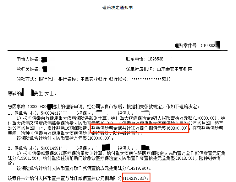 此次理賠申請(qǐng)合計(jì)賠付114219.86元并豁免了68800元的保費(fèi)。客戶對(duì)于理賠時(shí)效和理賠金額非常滿意。