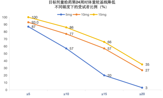 給藥第24周時,“輕悅塑”5mg組、10mg組和15mg組體重降低≥5%的受試者比例分別為87%、93%和100%,體重降低≥10%的受試者比例分別為57%、77%和86%,體重降低≥15%的受試者比例分別為20%、57%和66%,體重降低≥20%的受試者比例分別為3%、27%和35%。此外,“輕悅塑”10mg組和15mg組體重降低≥25%的受試者比例分別為13%和20%,降低≥30%的受試者比例分別為3%和7%。