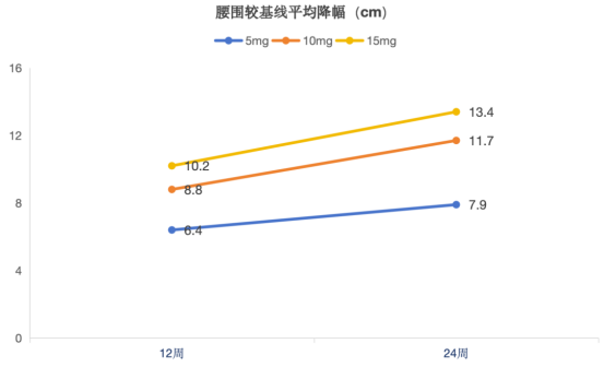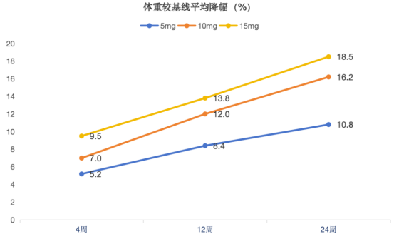 (1)體重:在給藥第4周時,“輕悅塑”5mg組、10mg組、15mg組體重平均降幅百分比為5.2%、7.0%和9.5%。給藥第12周時,體重降幅百分比分別為8.4%、12.0%和13.8%。給藥第24周時,體重降幅百分比分別為10.8%、16.2%和18.5%。