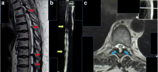 圖2 胸腔磁共振成像的矢狀面和軸向視圖,采用T1加強(qiáng)和T2加強(qiáng)圖像。a .T2加強(qiáng)磁共振成像的矢狀切片顯示,T3、T5、T8和T9等水平處多處脊髓受壓(紅色箭頭)。b . 磁共振成像-脊髓造影顯示T5和T9(黃色箭頭)水平處脊髓壓迫。c . T5椎骨水平的軸向視圖顯示左后部和右側(cè)的低強(qiáng)度腫塊(藍(lán)色箭頭)。
