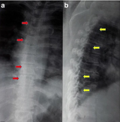 圖1 胸腔區(qū)域、前后側(cè)和側(cè)面的普通X光片。a 前后視角顯示脊柱畸形及胸椎周圍的腫塊沉積過程(紅色箭頭)。b 側(cè)面圖顯示脊柱管某一水平處有退行性腫瘤沉積(黃色箭頭))