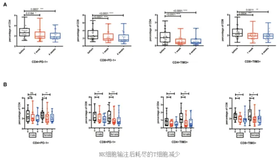 一項納入 37 名志愿者的隨機(jī)對照研究中,32 人接受自體擴(kuò)增 NK 回輸、5 人打生理鹽水,隨訪 4 周。結(jié)果顯示,NK 組多種“衰老型”和“耗竭型”T 細(xì)胞亞群明顯下降,IL-6、IL-8、IL-17 等炎癥因子水平同步下調(diào),被解讀為“部分逆轉(zhuǎn)免疫衰老和炎癥衰老的信號”。