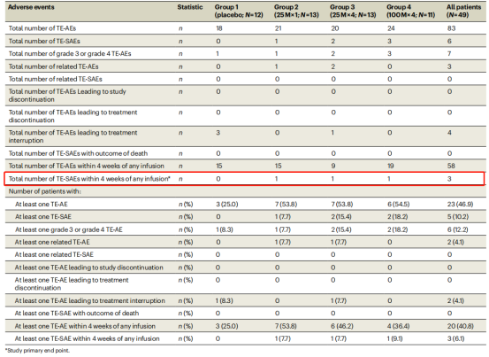 · 安慰劑組:每月靜脈輸注安慰劑,持續(xù) 4 個(gè)月;