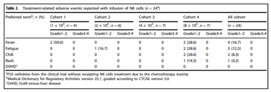 該研究共招募56例患者,其中,6例符合標(biāo)準(zhǔn)的患者進(jìn)入1期試驗(yàn),34例符合標(biāo)準(zhǔn)的患者及1例源自1a期試驗(yàn)的患者被納入2a期試驗(yàn)階段。在治療的前兩周內(nèi),患者接受了高活性的同種異體NK細(xì)胞,同時(shí)于第一周同步接受帕博利珠單抗治療。此后,遵循21天為一療程,對(duì)患者進(jìn)行周期性的治療。