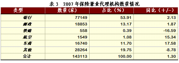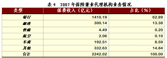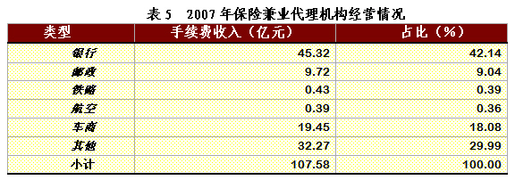 (三)經(jīng)營(yíng)情況 2007年,保險(xiǎn)兼業(yè)代理機(jī)構(gòu)實(shí)現(xiàn)代理手續(xù)費(fèi)收入107.58億元,同比增長(zhǎng)47.86% 。