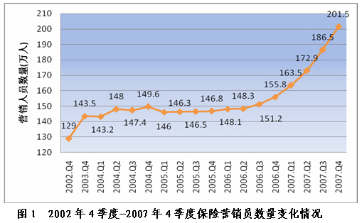 三、保險(xiǎn)營(yíng)銷(xiāo)員 (一)基本情況 截至2007年12月底,全國(guó)共有保險(xiǎn)營(yíng)銷(xiāo)員2014900 人,比2006年增加456811人,增長(zhǎng)29.32%。其中,壽險(xiǎn)營(yíng)銷(xiāo)員1767024人,增長(zhǎng)28.42%;產(chǎn)險(xiǎn)營(yíng)銷(xiāo)員247876人,增長(zhǎng)36.1%。 4季度末,全國(guó)保險(xiǎn)營(yíng)銷(xiāo)員持證率為99.2%,同比提高3.77個(gè)百分點(diǎn)。其中,產(chǎn)險(xiǎn)營(yíng)銷(xiāo)員持證率98.55%,上升3.14個(gè)百分點(diǎn);壽險(xiǎn)營(yíng)銷(xiāo)員持證率為99.29%,上升3.86個(gè)百分點(diǎn)。