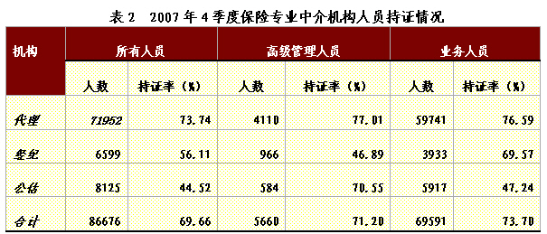 | 截至 2007年,保監(jiān)會(huì)共批設(shè)346家保險(xiǎn)專(zhuān)業(yè)中介機(jī)構(gòu)。[4]其中第4季度批設(shè)了60家。全年有174家保險(xiǎn)專(zhuān)業(yè)中介機(jī)構(gòu)終止經(jīng)營(yíng),第4季度有26家退出市場(chǎng),占現(xiàn)有保險(xiǎn)專(zhuān)業(yè)中介機(jī)構(gòu)總數(shù)的1.12%。 截至12月底,全國(guó)保險(xiǎn)專(zhuān)業(yè)中介機(jī)構(gòu)共有工作人員86676人,持證率69.66%。其中,業(yè)務(wù)人員69591人,持證率73.7%。代理機(jī)構(gòu)持證情況最好,達(dá)到73.74%;經(jīng)紀(jì)機(jī)構(gòu)和公估機(jī)構(gòu)持證率分別達(dá)到56.11%和44.52%。經(jīng)紀(jì)機(jī)構(gòu)持證率提高幅度最大,同比提高了10.38個(gè)百分點(diǎn)。 |