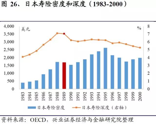 根據(jù)興業(yè)證券介紹,二戰(zhàn)以后,日本經(jīng)濟進入高速增長的20年。隨著收入水平提升,居民對保險需求隨之提升,加上經(jīng)濟高速發(fā)展,日本保險業(yè)進入了黃金發(fā)展時期。據(jù)興業(yè)證券統(tǒng)計,1951-1990年,日本壽險保費收入增長了1348.5倍,年復合增長率20.3%。
