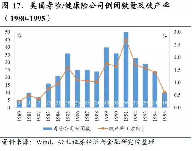 據(jù)興業(yè)證券統(tǒng)計,美國壽險公司數(shù)目在1988年達到2343家后,經(jīng)歷過兩波破產(chǎn)潮,最終不斷調(diào)整至2016年的797家。