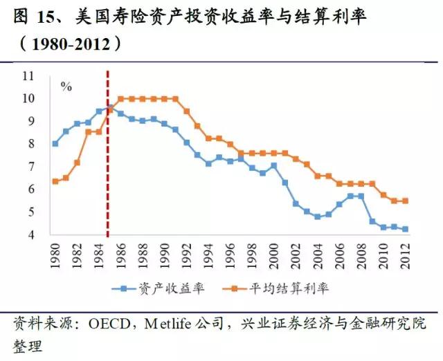 債券市場的波動給壽險公司帶來了巨額利差損,嚴重影響了壽險業(yè)。興業(yè)證券以美國大都會人壽(Metlife)為例,介紹了當時的狀況。1985年以前,該公司壽險業(yè)務資產(chǎn)投資收益率高于公司結(jié)算利率,且處于上漲趨勢中。1986年后,資產(chǎn)投資收益率開始低于壽險保單的平均結(jié)算利率,截止2012年尚未回轉(zhuǎn)。