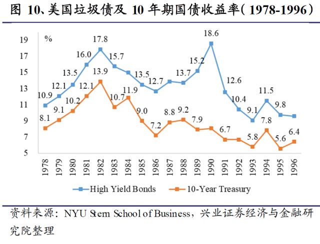 利率市場放開后,銀行開始進行高風險投資以提高存款利率吸引儲戶。同時期的保險公司除了面臨行業(yè)內(nèi)的競爭外,還加入了與銀行的客戶爭奪之中,高收益高風險資產(chǎn)成為壽險公司的選擇。正是在80年代期間,美國資本市場上高收益?zhèn)蠢鴤找媛逝c10年期國債收益率平均利差達到5.3%,吸引了金融機構(gòu)的投資。